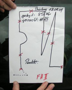 Leistungsrichter eine Geländeskizze an. Der Verlauf der Fährte ist mit